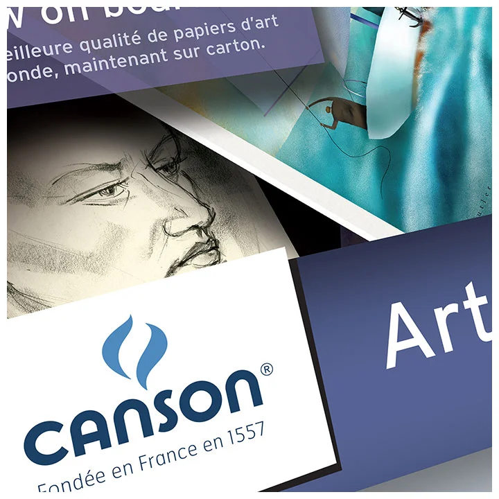 A selection of packaging designs for Canson, French manufacturer of art papers. The sampling includes covers for artist pad lines, photo corners, recycled papers gift set, blank journal cover designs, and merchandising label systems for scrapbooks and photo albums.